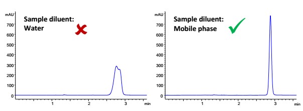 當(dāng)使用親水相互作用液相色譜法(HILIC)時,樣品稀釋劑的選擇對峰形有顯著的影響。稀釋劑的錯誤選擇可能會導(dǎo)致色譜峰形差,峰分裂和保留時間的不穩(wěn)定。