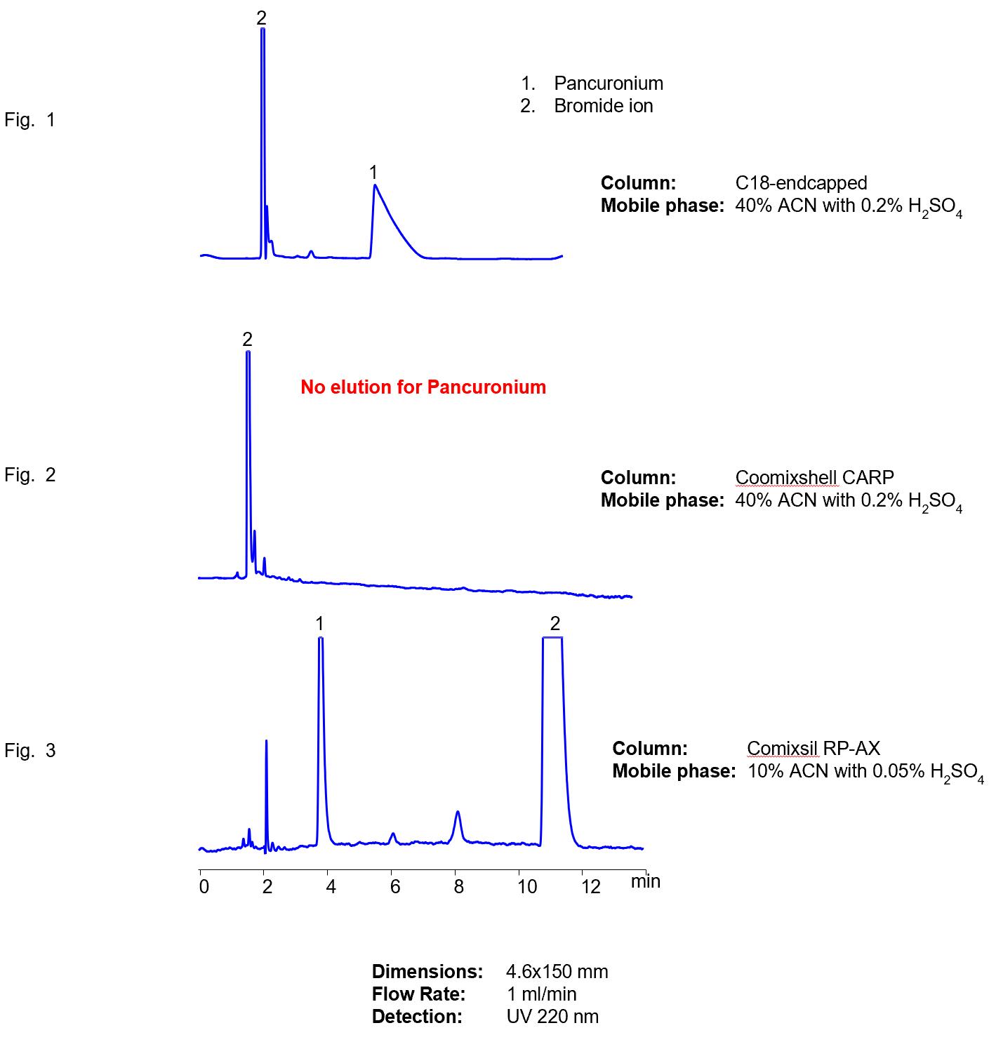 Mixed-mode chromatography usually adds secondary and tertiary interactions which help to achieve controlled retention, unique selectivity and allow to adjust retention time of various compounds by changing the amount of organic, buffer concentration, buffer pH and buffer nature(混合模式色譜法通常增添二重和三重相互作用,有助于實現(xiàn)可控的保留,獨特的選擇性,并通過改變有機溶劑的含量,緩沖濃度,緩沖pH值和緩沖鹽的性質(zhì)來調(diào)整各種化合物的保留時間。 ). Presence of ionizable groups on the column also helps improve peak shape for various analytes, which sometimes is impossible to achieve with single mode columns.(色譜柱上存在可電離基團也有助于改善各種分析物的峰形,一些時候,這在單一模式色譜柱上是不可能實現(xiàn)的) Pancuronium bromide is a hydrophobic compound with two strong basic groups. It shows a poor peak shape when RP columns are used(泮庫溴銨是一種具有兩個強堿性基團的疏水化合物。當(dāng)采用RP柱時,峰形較差。). The poor peak shape is attributed to secondary interaction between analyte and silanols on the surface of RP columns (分析物與在RP柱表面的硅烷醇二次相互作用導(dǎo)致峰形較差) (Fig. 1). Sometimes you need to understand what secondary interaction to add to improve your chromatography(有時,你需要了解增加什么樣的二次相互作用來改善你的色譜方法). In case of pancuronium bromide, addition of cation-exchange mechanism did not work and target compound never eluted, (Fig. 2) even with very strong mobile phase from the column due to three strong interactions (reversed-phase and two cation-exchange interactions)(在泮庫溴銨的例子下,添加陽離子交換機制不起作用,目標(biāo)化合物也沒有洗脫(圖2)。即使柱內(nèi)流動相洗脫能力很強,存在三種強烈的相互作用(反相作用和兩種陽離子交換作用),化合物也沒有得到保留.)Problem of elution and peak shape was addressed by changing cation-exchange interaction to cation-exclusion interaction. This allowed to retain and analyze both the drug and counterion with simple isocratic conditions (Fig. 3)(通過將陽離子交換相互作用轉(zhuǎn)變?yōu)殛栯x子排斥相互作用,解決了洗脫和峰形問題。這樣就可以在簡單的等度條件下保留和分析藥物和反離子).