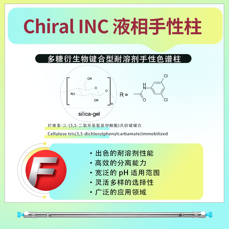 固定相:Chiral INC 鍵合型耐溶劑手性柱的固定相為纖維素-三-(3,5-二氯苯基氨基甲酸酯)共價鍵鍵合(Cellulose tris(3,5-dichlorolphenylcarbamate)immobilized)。這種特殊的固定相設計使得該手性柱具有優異的手性識別能力和分離效率。