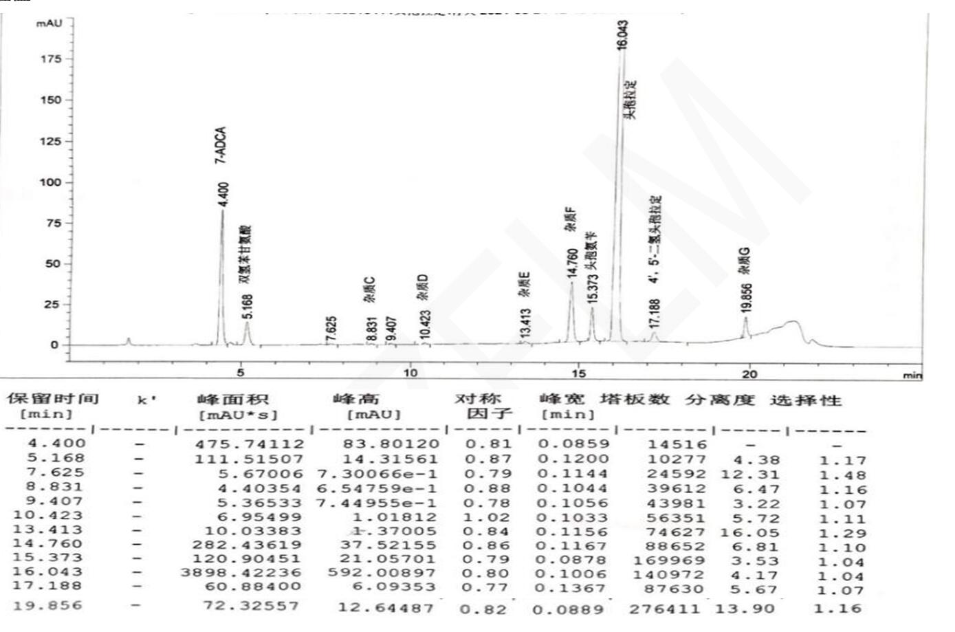 客戶評價:頭孢拉定的保留時間約為 15min,7-氨基去乙酰氧基頭孢烷酸、雙氫苯甘氨酸、雜質(zhì) C、雜質(zhì) D、雜質(zhì) E、雜質(zhì) F、頭孢氨芐、4',5'-二氫頭孢拉定和雜質(zhì) G 依次出峰,頭孢拉定和頭孢氨芐的分離度應(yīng)不 小于 4. 0,其他各組分峰間分離度符合規(guī)定。