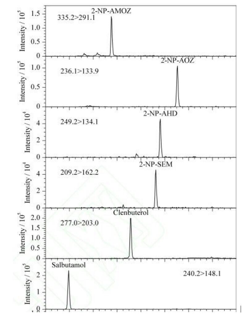 App ID: FLM-T240003 (甲硝唑氯霉素氯丙嗪克侖特羅沙丁胺醇等) 色譜柱:Titank C18 3u 100*2.1mm 貨號:FMD-5559-BONU 流動相:A 乙腈 B 0.1%甲酸 流速:0.3ml/min 進樣體積:5 μL 柱溫:40℃