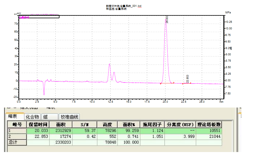 評(píng)價(jià):要求與相鄰酸性降解產(chǎn)物峰的分離度應(yīng)不小于 2.0;理論板數(shù)按莫匹羅星峰計(jì)算不低于 1500,拖尾因子不大于 2.0。均符合要求,且效果很好。