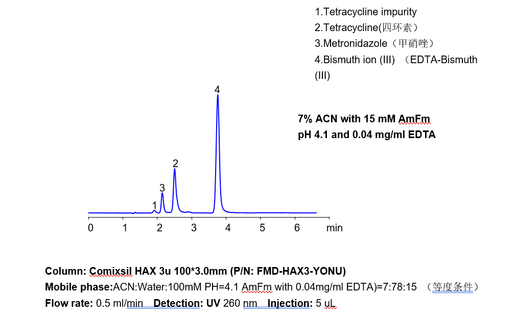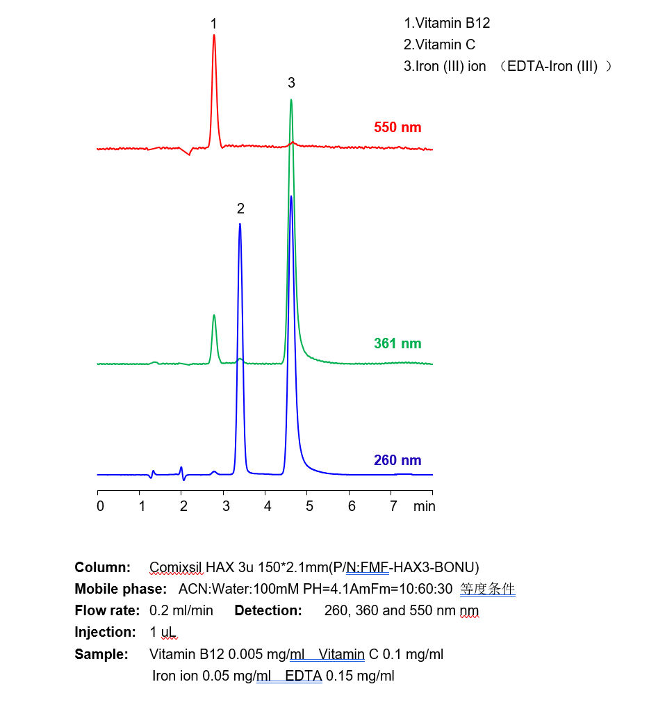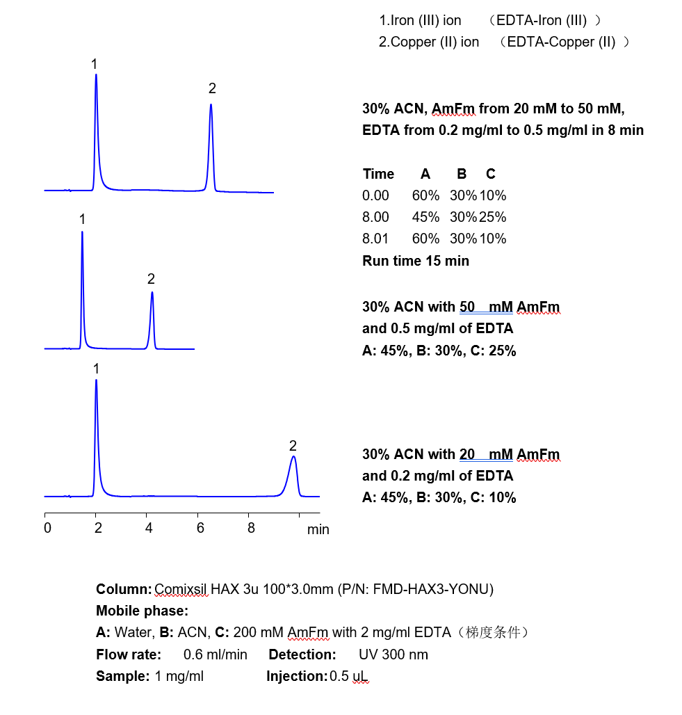 三價鐵離子等三價金屬離子,在硅膠基質(zhì)的色譜柱中極易死吸附,從而損壞色譜柱,在液相直接檢測中存在較大難度。 本方法研究三價鐵離子與EDTA形成紫外可見的強(qiáng)吸收絡(luò)合物,再通過Comixsil HAX色譜柱保留。通過對絡(luò)合物的定量從而定量三價鐵離子等三價金屬離子。 應(yīng)用一:三價鐵離子的檢測 方法A、三價鐵離子流動相中與EDTA絡(luò)合