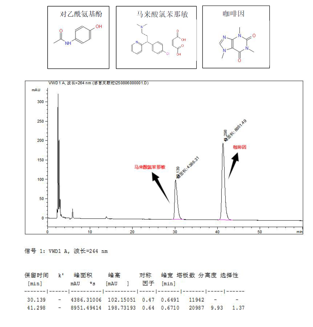 說明:SuperLu C18-AQ 色譜柱實(shí)驗(yàn)結(jié)果,分析對(duì)乙酰氨基酚、馬來酸氯苯那敏和咖啡因,分離度大,峰型良好,柱效高,完全滿足檢測(cè)要求。 |