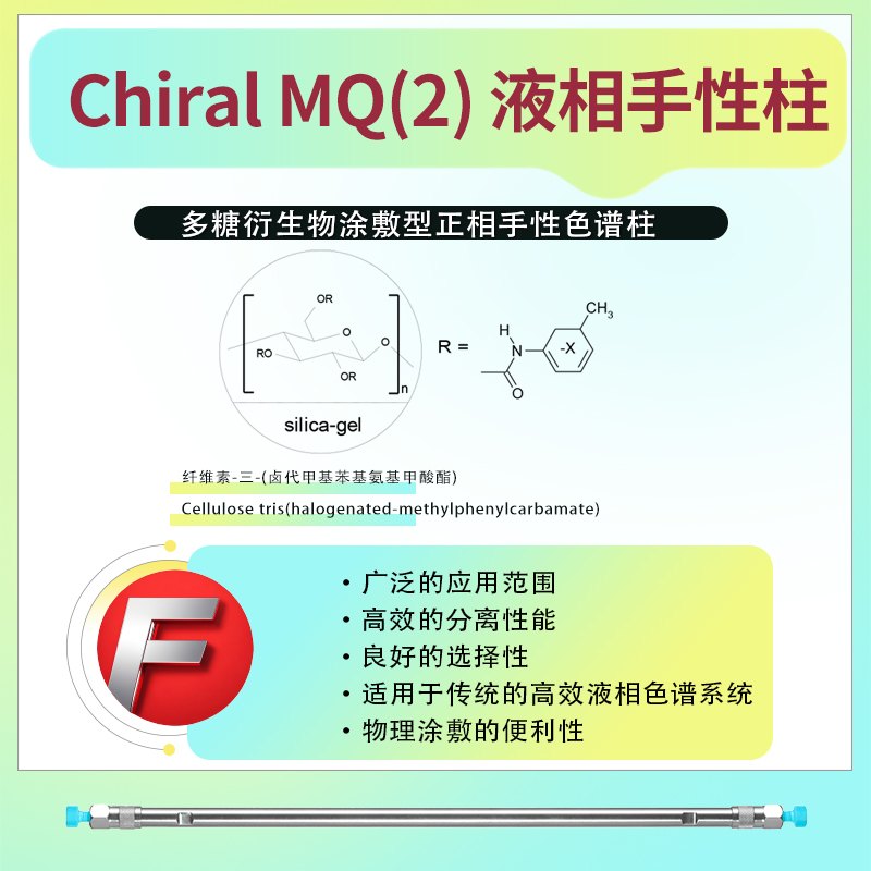 1. **固定相**:Chiral MQ(2)-RH反相手性柱的固定相為纖維素-三-(鹵代甲基苯基氨基甲酸酯)(Cellulose tris(halogenated-methylphenylcarbamate))。這種固定相具有優異的手性識別能力,能夠有效地分離不同的光學異構體。