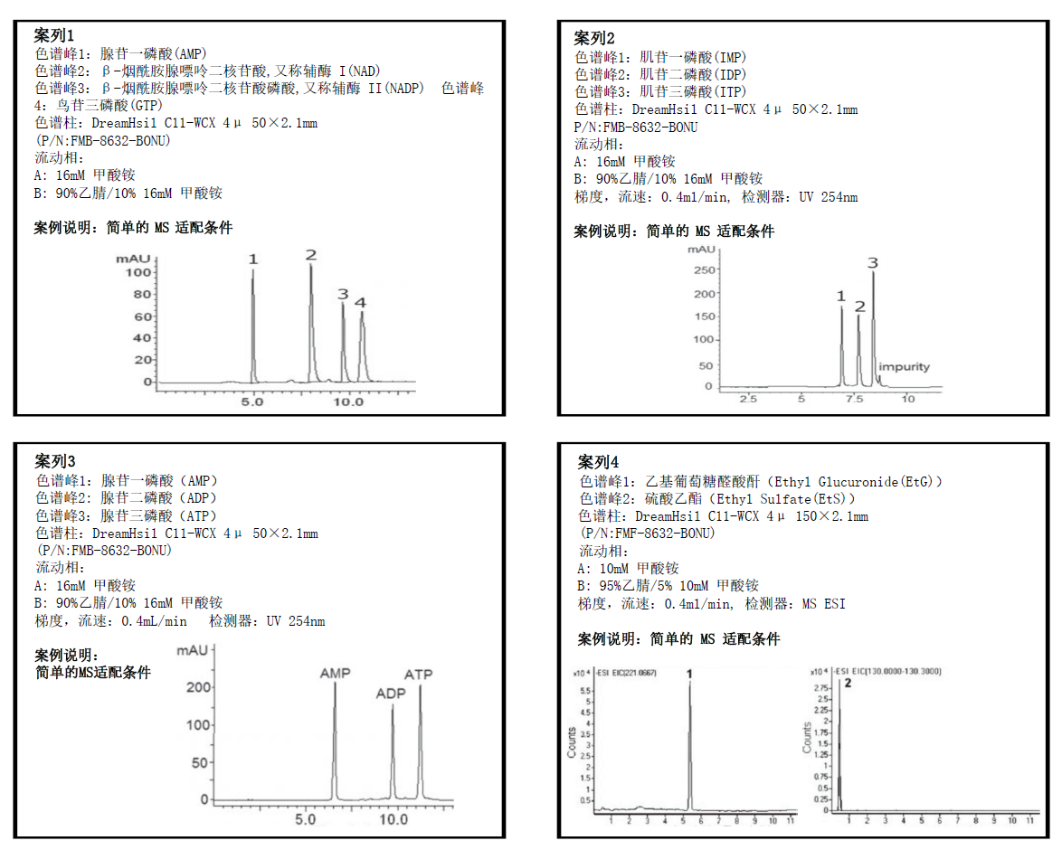 當(dāng)流動(dòng)相的pH高于6時(shí),羧基 90%電離成帶負(fù)電基團(tuán),而PH在6.9以上時(shí),幾乎全部電離,此時(shí),可以主要考慮它的陽(yáng)離子交換作用。 DreamHsil C11-WCX 色譜柱是分析人員用LC-MS分析相似物質(zhì)時(shí)的一個(gè)好選擇。