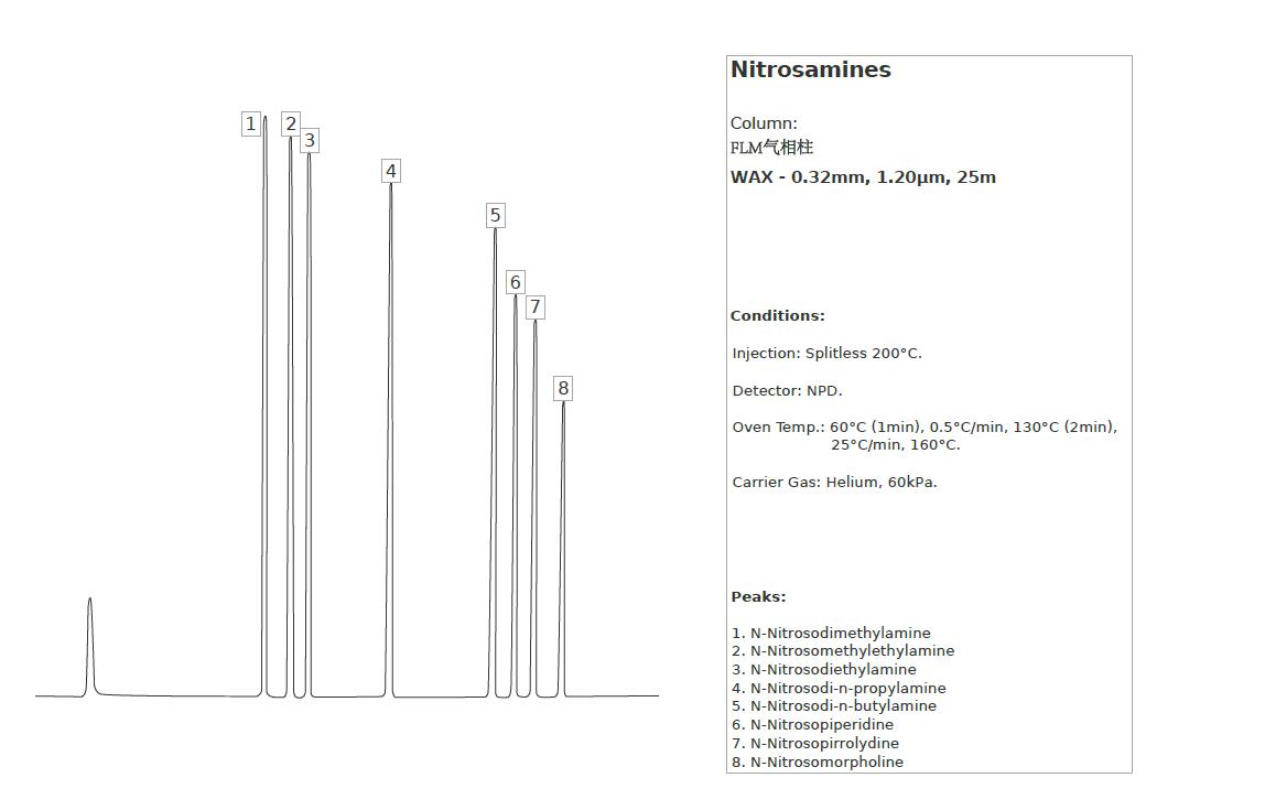N-亞硝酸銨類化合物的分離(基因毒性和元素雜質(zhì)相關(guān)應(yīng)用圖譜)菲羅門氣相柱