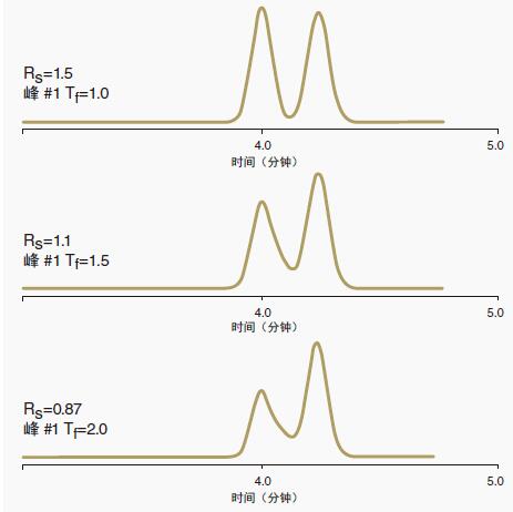 隨著峰拖尾(Tf,拖尾因子)從1.0增加到2.0,分離度(Rs)從1.5下降到0.87。