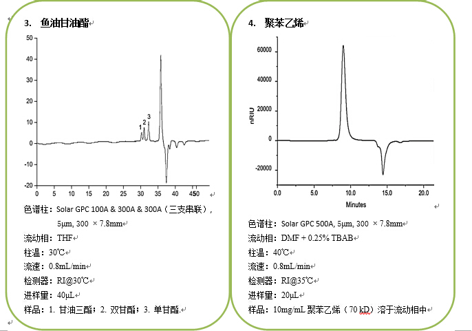 Solar系列體積排阻色譜柱,以高交聯(lián)度的聚苯乙烯/二乙烯苯(PS/DVB)顆粒為基質(zhì),具有極窄的粒徑和孔徑分布,使分析中保留時(shí)間與分子量具有準(zhǔn)確的線性關(guān)系。高交聯(lián)度的多孔顆粒具有優(yōu)異的化學(xué)和物理穩(wěn)定性,因此在更換有機(jī)溶劑時(shí)可以使分子量校正曲線的形狀和色譜柱的柱效幾乎保持不變。